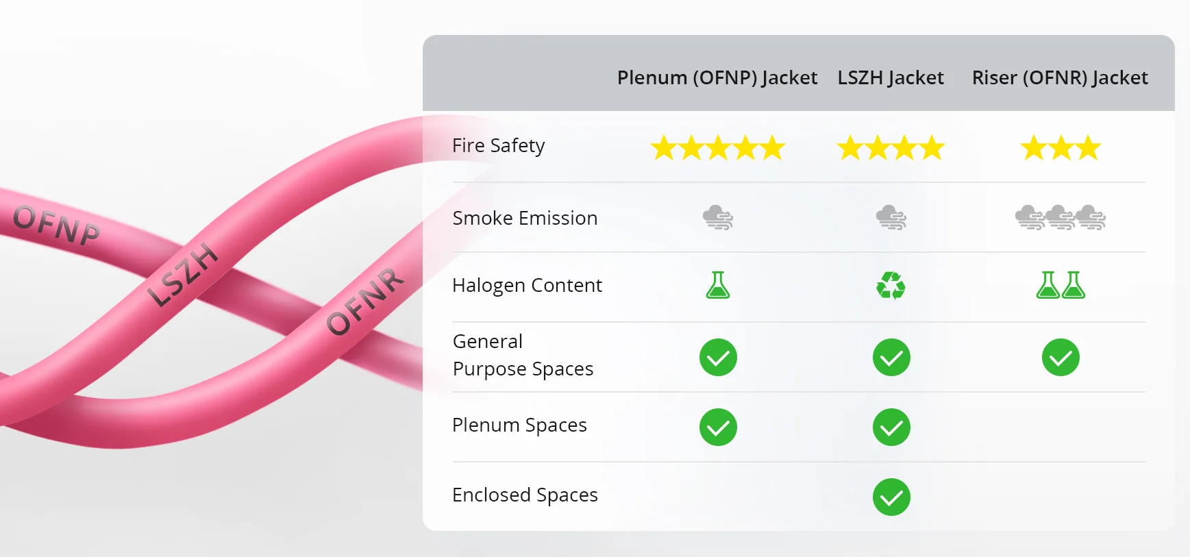 Cable Jacket Option: Plenum(OFNP), Low Smoke Zero Halogen(LSZH), Riser(OFNR) rated applications.