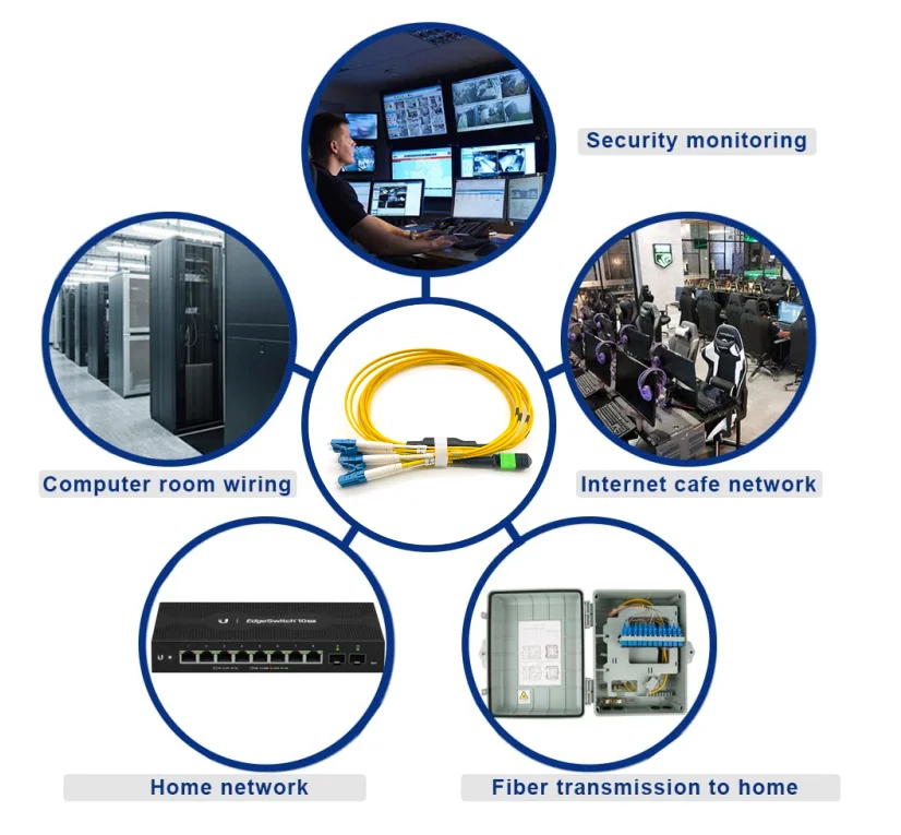 MPO breakout cable, a cost-effective alternative to time-consuming field termination, is designed for high-density fiber patching in data centers which need space saving and reduce cable management troubles. It is optimized for 40G QSFP+ PLR4 to 10G SFP+ LR, 400G OSFP/QSFP-DD DR4 to 100G QSFP DR and 400G OSFP/QSFP-DD XDR4 to 100G QSFP FR optics direct connection and high-density data center applications.