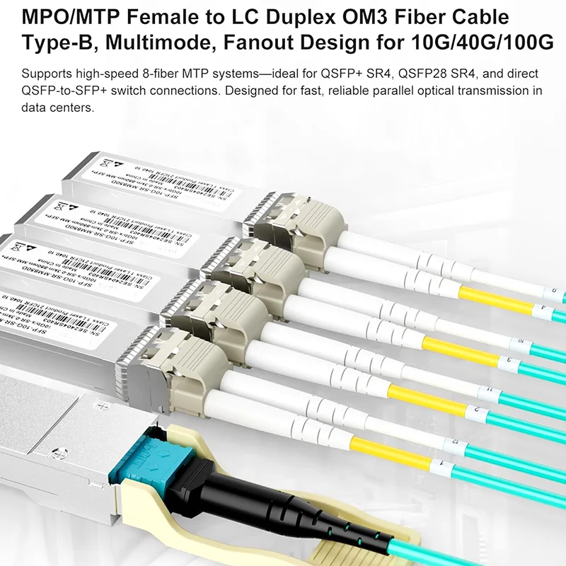 MPO breakout cable, a cost-effective alternative to time-consuming field termination, is designed for high-density fiber patching in data centers which need space saving and reduce cable management troubles. It is optimized for 40G QSFP+ PLR4 to 10G SFP+ LR,400G OSFP/QSFP-DD DR4 to 100G QSFP DR and 400G OSFP/QSFP-DD XDR4 to 100G QSFP FR optics direct connection and high-density data center applications.