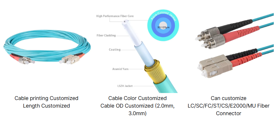 Customized Duplex OM3/OM4 50/125μm Multimode FC UPC to SC UPC Fiber Optic Patch Cord