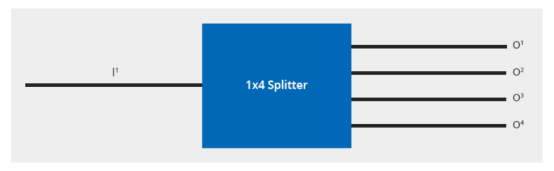 Specifically speaking, the passive optical splitter can split, or separate, an incident light beam into several light beams at a certain ratio. The 1×4 split configuration presented below is the basic structure: separating an incident light beam from a single input fiber cable into four light beams and transmitting them through four individual output fiber cables. For instance, if the input fiber optic cable carries 1000 Mbps bandwidth, each user at the end of output fiber cables can use the network with 250 Mbps bandwidth.