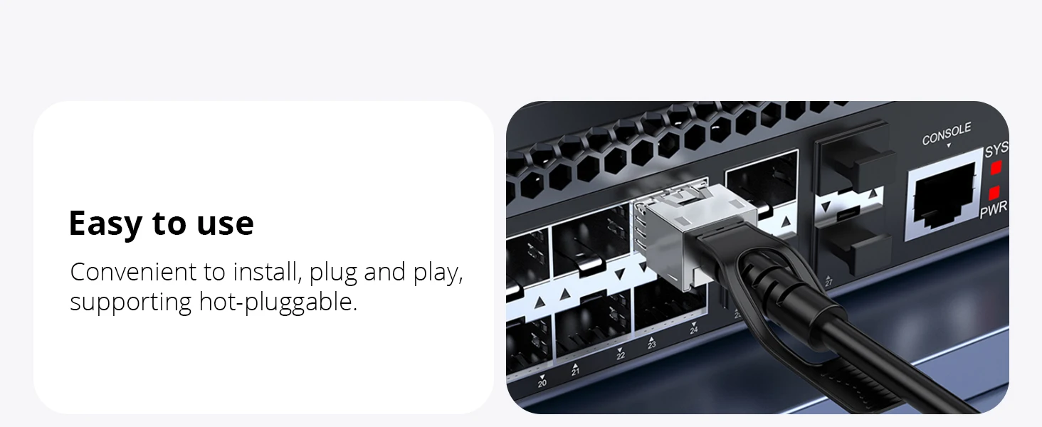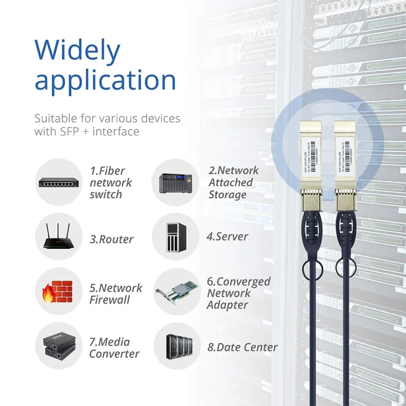 Direct attach copper is suitable for very short links and offer a cost-effective way to establish a 10-Gigabit link between SFP+ 10G ports within racks and across adjacent racks.