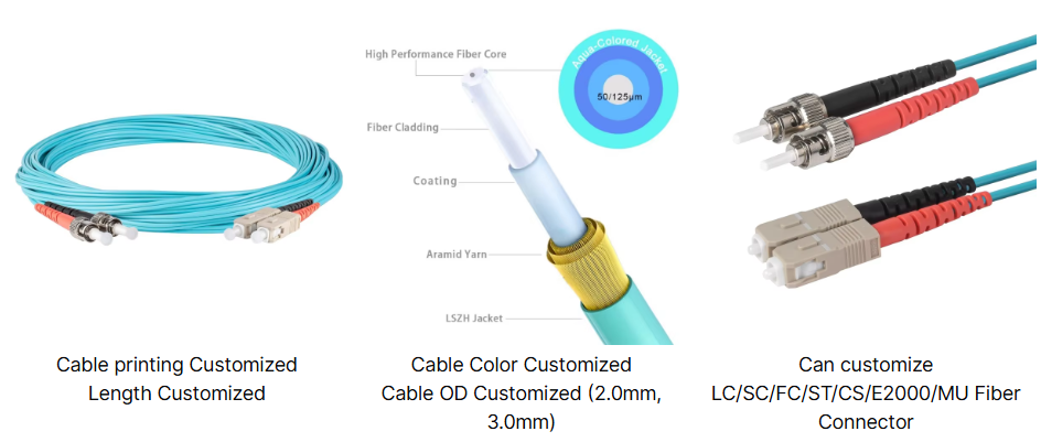 Customized Duplex OM3/OM4 50/125μm Multimode ST UPC to SC UPC Fiber Optic Patch Cord